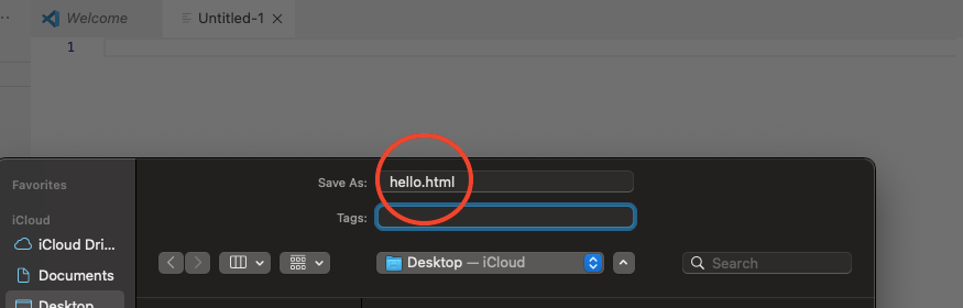 File–>Save as(command + S on a mac) and name the file whatever you want as long as you add the extension “.html” ~ read as dot html. You’ll always be saving HTML files like this: FileName.html.